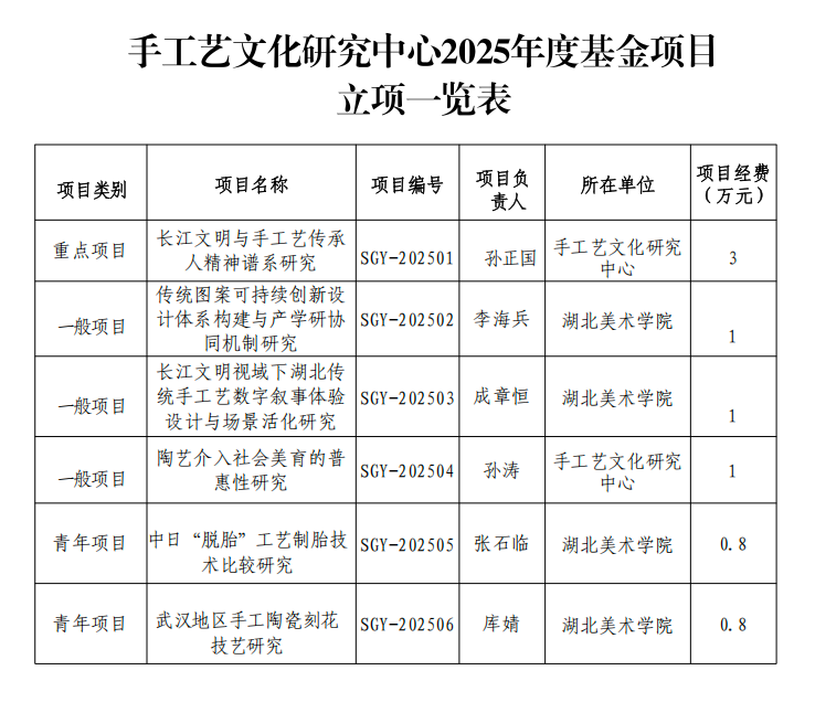 手工艺文化研究中心2025年度基金项目,按照公开发布年度基金项目指南、自主申请、专家评审、平等竞争、择优支持的资助机制,经专家评选,中心学术委员会审核,中心主管部门研究决定,现对外公布2025年度手工艺文化研究中心立项清单(湖美科字〔2025〕8号)。请各项目负责人做好项目预算、廉洁承诺书、立项任务书等工作。